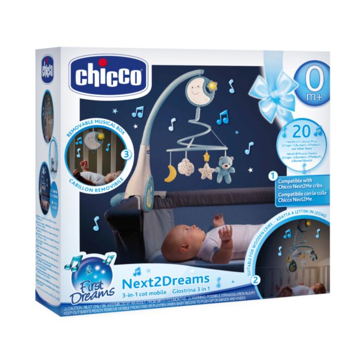 - Σχεδιασμένο από την Chicco για να προσαρμόζει στα λίκνα της σειράς Next2Me, αλλά που μπορεί να εγκατασταθεί γρήγορα και στις περισσότερες ξύλινες κούνιες, το Παιχνίδι Κούνιας Next2Dreams είναι ένα μοντέρνο μουσικό παιχνίδι που μεταδίδει μουσική και ήχους ικανό να χαλαρώσει γρήγορα το μωρό σας.
