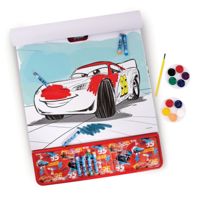 Ένα σετ με όλα όσο χρειάζεσαι για να γνωρίσεις τους αγαπημένους σου ήρωες Cars και να τους χρωματίσεις με όμορφα χρώματα, μπαίνοντας μαζί τους στον αγώνα δρόμου. Διάλεξε ένα χρώμα από τις κηρομπογιές ή ανάμιξε τα χρώματα νερομπογιάς που θέλεις και χρωμάτισε τα αγαπημένα σου αυτοκίνητα σε διάφορες σκηνές της καθημερινής τους ζωής, στους αγώνες, στις βόλτες τους αλλά και όταν μιλάνε.